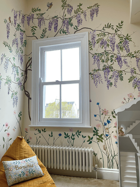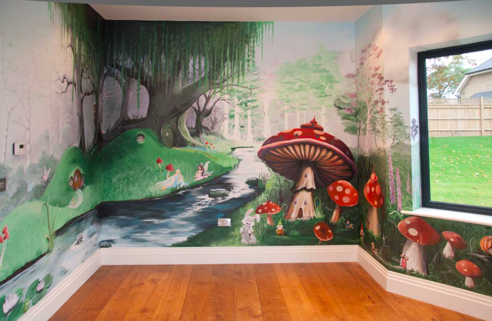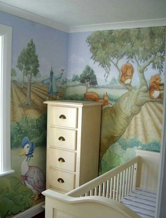 Hand-painted walls share something special. They not only add unique charm and character to your home, they also convey a caring, sentimental love. Store-bought, beige decor just can’t compare compare to the loving labor of a sentimental painting, adorning a childhood bedroom. Indeed, hand-painted artwork is the loveliest addition to cozy up a home- perfect for your cottage! Now for the inspiration: