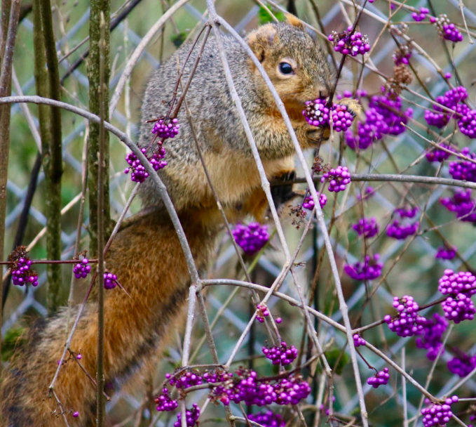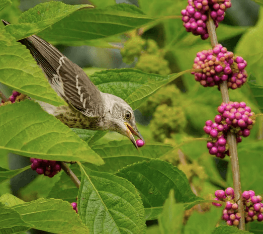 The beautyberry’s biggest fanbase is birds, with over 40 species of them including mockingbirds, robins, and warblers, enjoying the bright snack.