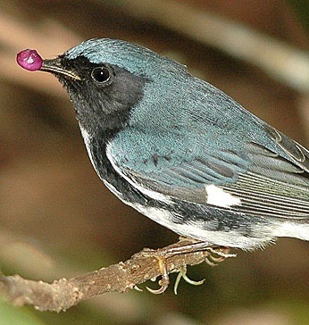 Black-throated blue warbler by surrounded by beautyberries by: Will Stuart
