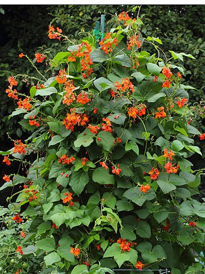 Scarlet runner beans also boast bright, red-orange flowers and pointed leaf clusters, which can grow between 6-18 feet tall! Even their light-green bean pods can grow up to 1 foot in length!